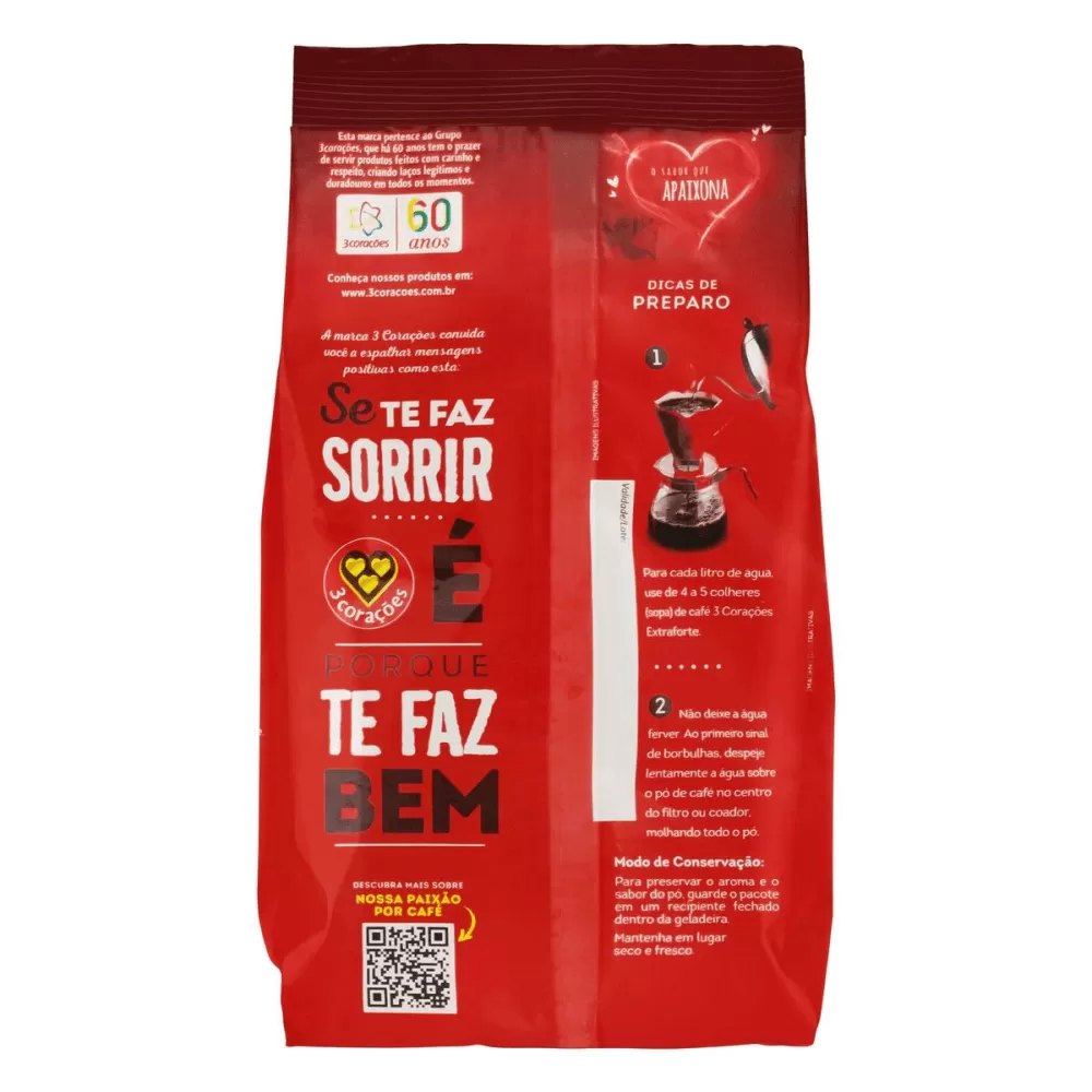 desde o cultivo, passando pelas etapas de torra e moagem, até chegar a xícara, o café 3 corações extra forte está assegurado por altos padrões de qualidade e promove através de sua bebida, um aroma intenso e que enche seu dia de energia.