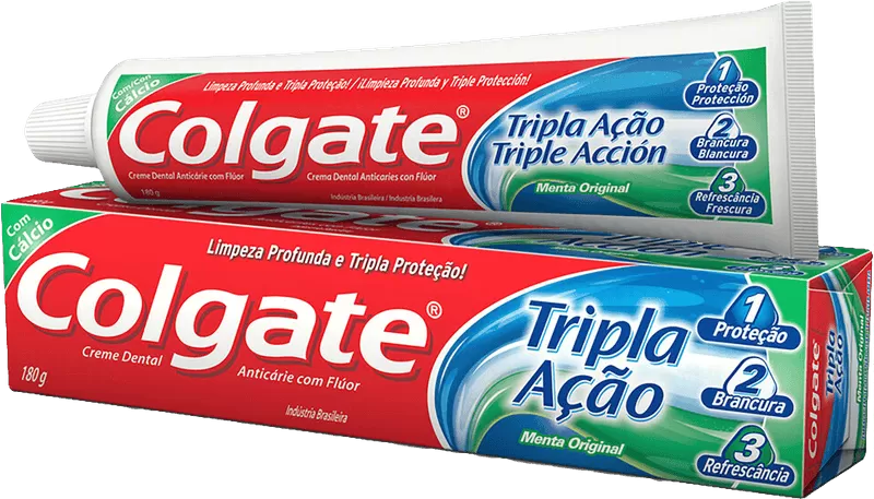 descrição de marketing: a pasta de dente colgate tripla ação menta original proporciona tripla proteção para você e sua família: dentes brancos, protegidos e um hálito refrescante.