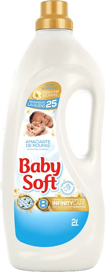 amaciante de roupa diluído toque de cuidado baby soft frasco 2l é um amaciante de alta qualidade, desenvolvido especialmente para manter as roupas de seu bebê macias e perfumadas. com componentes imaculadamente selecionados, é dermatologicamente testado, para fornecer um cuidado ainda mais suave às roupas do seu bebê. seu frasco de 2 litros contém muito mais do que apenas uma deliciosa fragrância, suas roupas também ficarão macias ao toque.