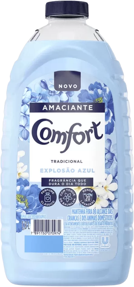 descrição de marketing: o amaciante diluído comfort tradicional explosão azul foi pensado especialmente para deixar as suas roupas macias, com perfume inesquecível e prolongado. a sua nova fórmula contém cápsulas de perfume que deixam as roupas com cheirinho de lavadas durante o dia todo. é a fragrância tradicional de comfort que você já conhece, agora com toque de baunilha e perfume mais duradouro para as suas roupas. o amaciante diluído comfort tradicional explosão azul tem o perfume clássico de comfort e garante maciez para as roupas de toda a família, deixando-as mais leves e confortáveis de usar. o uso do amaciante de roupas comfort diluído deixa as suas peças mais macias, fáceis de passar e perfumadas. o amaciante comfort protege as fibras do desgaste natural do uso das roupas e deixa as peças com toque suave e perfume duradouro. usar o amaciante comfort na hora de lavar suas roupas é muito simples: consulte a quantidade recomendada na embalagem e, dosando o amaciante conforme indicado, despeje a quantidade de produto dentro do compartimento de sua máquina de lavar. em seguida, escolha o ciclo de lavagem desejado. se preferir, o amaciante diluído comfort tradicional explosão azul também pode ser usado na lavagem das suas roupas no tanque.