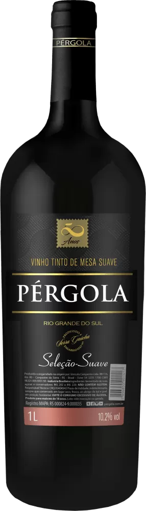 o vinho brasileiro tinto suave seleção pérgola serra gaúcha 1l é um excelente acompanhamento para pratos à base de carne, frutos do mar, saladas ou queijos suaves. todos os ingredientes deste vinho são produzidos na serra gaúcha como o resultado de uma produção cuidadosa e artesanal que resulta em um vinho tinto refinado e suave.