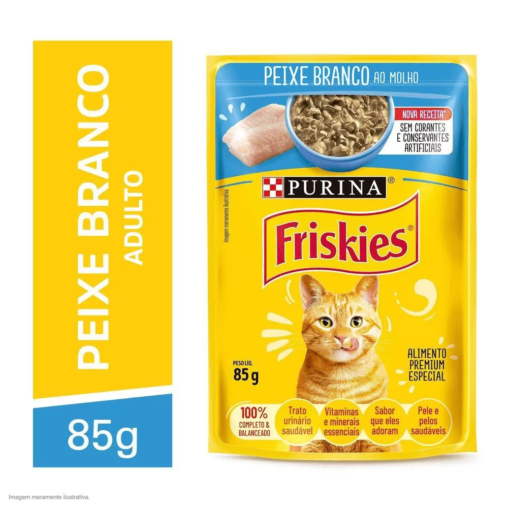 friskies® peixe branco é um alimento úmido com sabor que os gatos adoram. é um alimento saboroso feito de pedaços com carne em um molho, sem corantes e conservantes artificiais. é um alimento premium especial, 100% completo e balanceado para gatos. contribui para um trato urinário saudável e auxilia na hidratação diária. ajuda a manter o seu gato saudável através da combinação de vitaminas e minerais essenciais. contribui para pele e pelos saudáveis. proteínas de alta qualidade que contribuem para manter músculos fortes. para mais informações, acesse https://www.nestle.com.br/marcas/purina-friskies ou ligue para 0800-7701180.